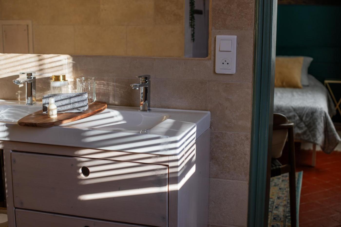 Chambre Double ou Lits Jumeaux. This twindouble room has a electric kettle and air conditioning. The shower and sink are inside the room, and the toilets are next door and private. ;