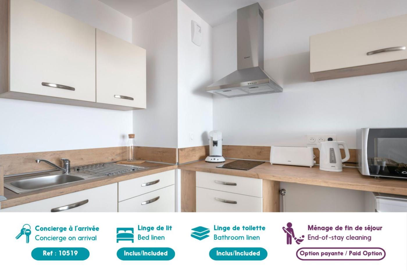 Cet appartement comprend 1 chambre, une télévision, une cuisine équipée avec un réfrigérateur et un lave-vaisselle, un lave-linge, ainsi que 1 salle de bains avec une douche.