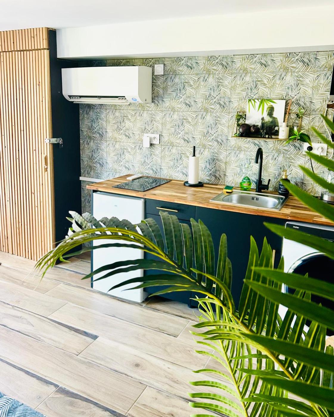 Appartement 1 Chambre. This apartments standout features are the hot tub and fireplace. Boasting a private entrance, this air-conditioned apartment includes a kitchen, 1 bedroom and 1 bathroom with a bath and a shower. Guests can make meals in the kitchen that is fitted with a stovetop, a refrigerator, kitchenware and a microwave. Featuring a terrace with garden views, this apartment also offers a washing machine and a flat-screen TV with streaming services. The unit has 1 bed.