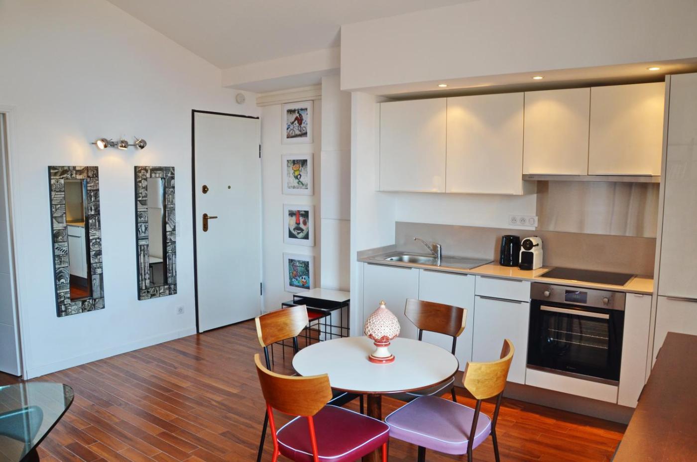 Appartement 1 Chambre. Orienté au sud, cet appartement est insonorisé. Ce logement comprend une pièce à vivre avec une kitchenette équipée d’une machine à café Nespresso et d’une bouilloire électrique. La chambre dispose d’un grand lit double et d’une armoire. La salle de bains privative est pourvue d’une douche à l’italienne et d’un lave-lingesèche-linge. Les serviettes et le linge de lit sont fournis. Vous pourrez stationner à proximité dans un parking payant ou dans la rue.